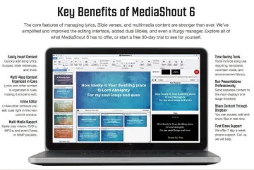¿Por qué elegir MediaShout?. MediaShout es un software de presentación de la iglesia con numerosas funciones que está diseñado para ser fácil de usar para voluntarios que pueden tener experiencia limitada.Tómese unos minutos para aprender más sobre la interfaz,las características,la flexibilidad y las integraciones que ofrece MediaShout 6.